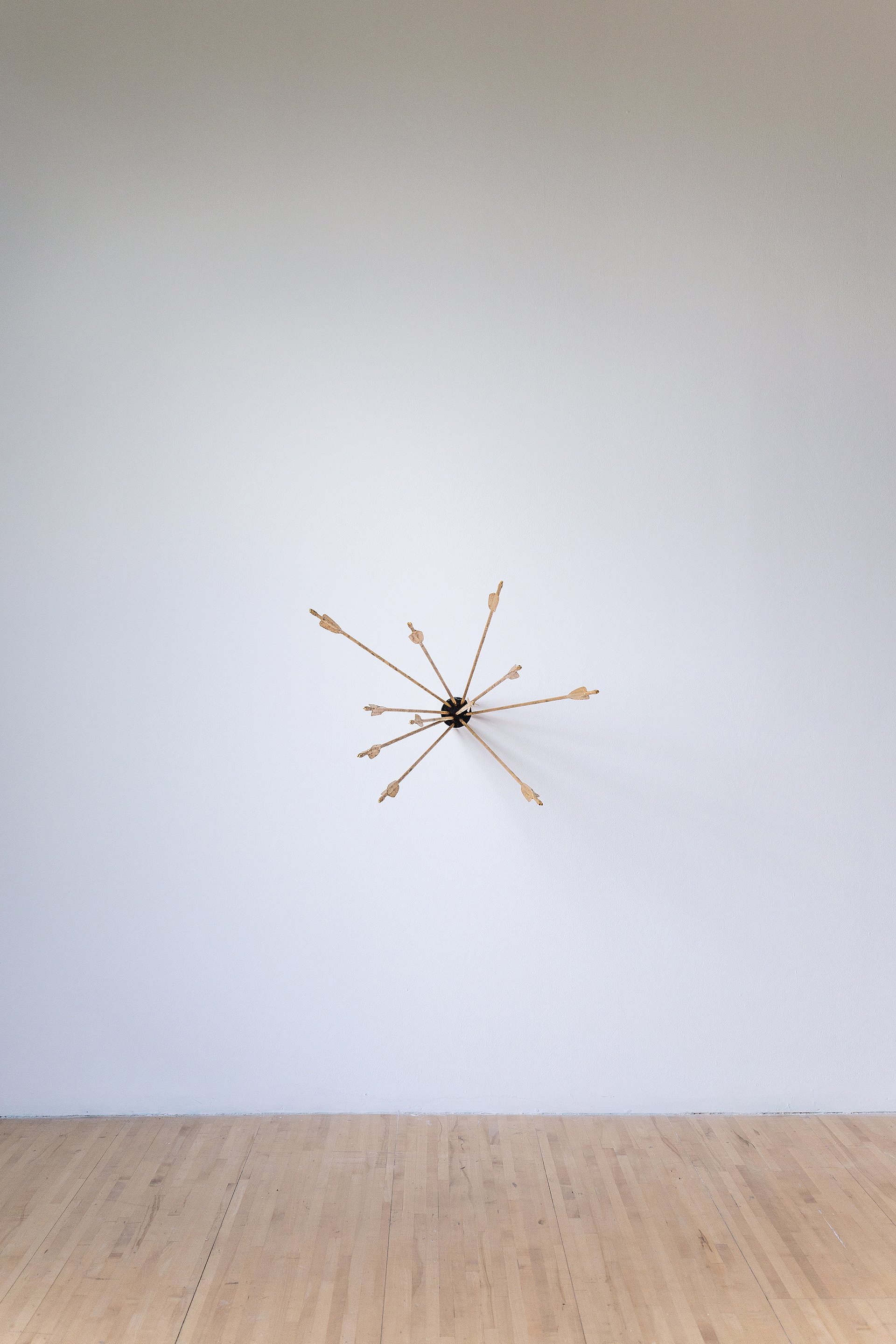 Metallic foil on archery arrows in wall.